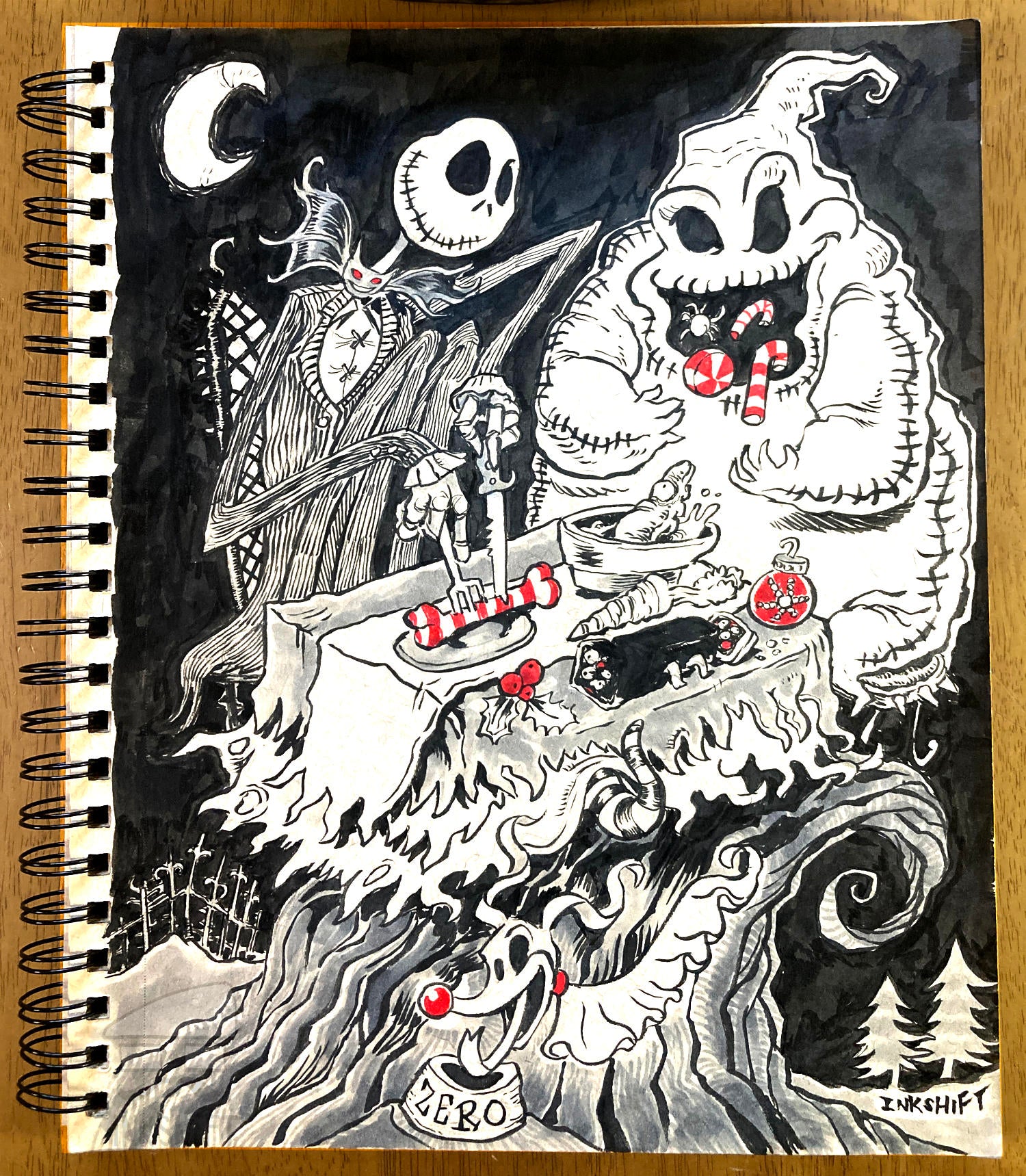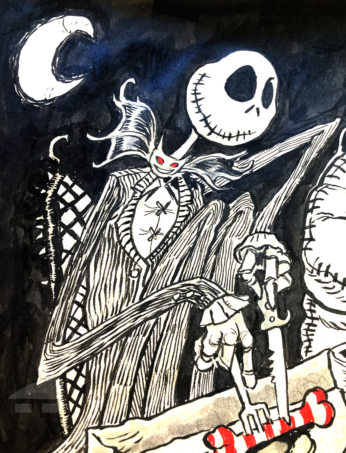 I absolutely love Nightmare Before Christmas so i couldn't resist this piece. Enjoy these two fellas having a lovely dinner! Even Zero was invited.9x12 on tan Strathmore paper with india ink, red ink & Copic markers.*ALL ORIGINAL ART SHIPS FREE, SHOPIFY PAYMENT PLANS AVAILABLE*