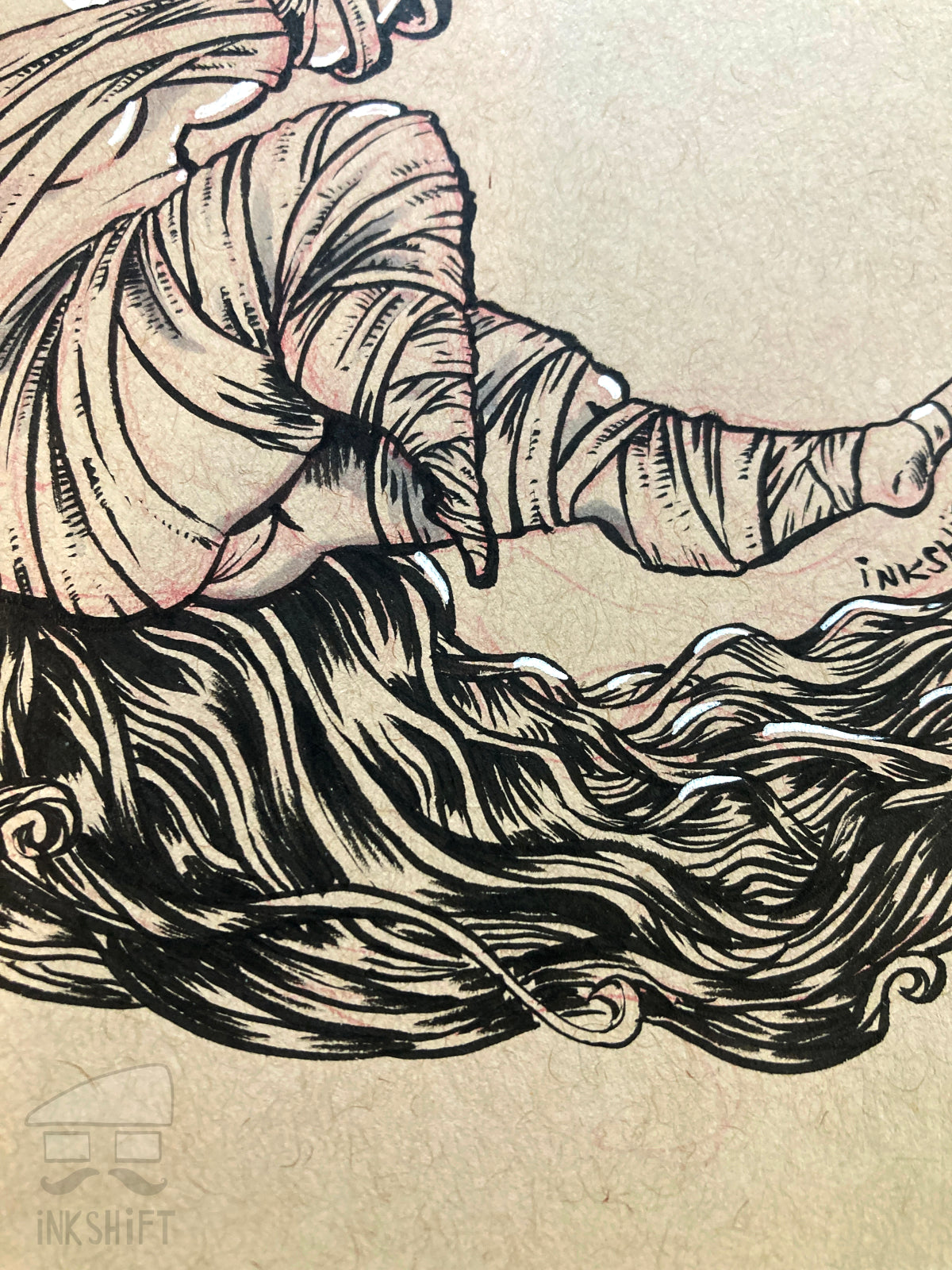 7.75 "x 9.75 - India Ink, grey wash & red on tan Strathmore paper