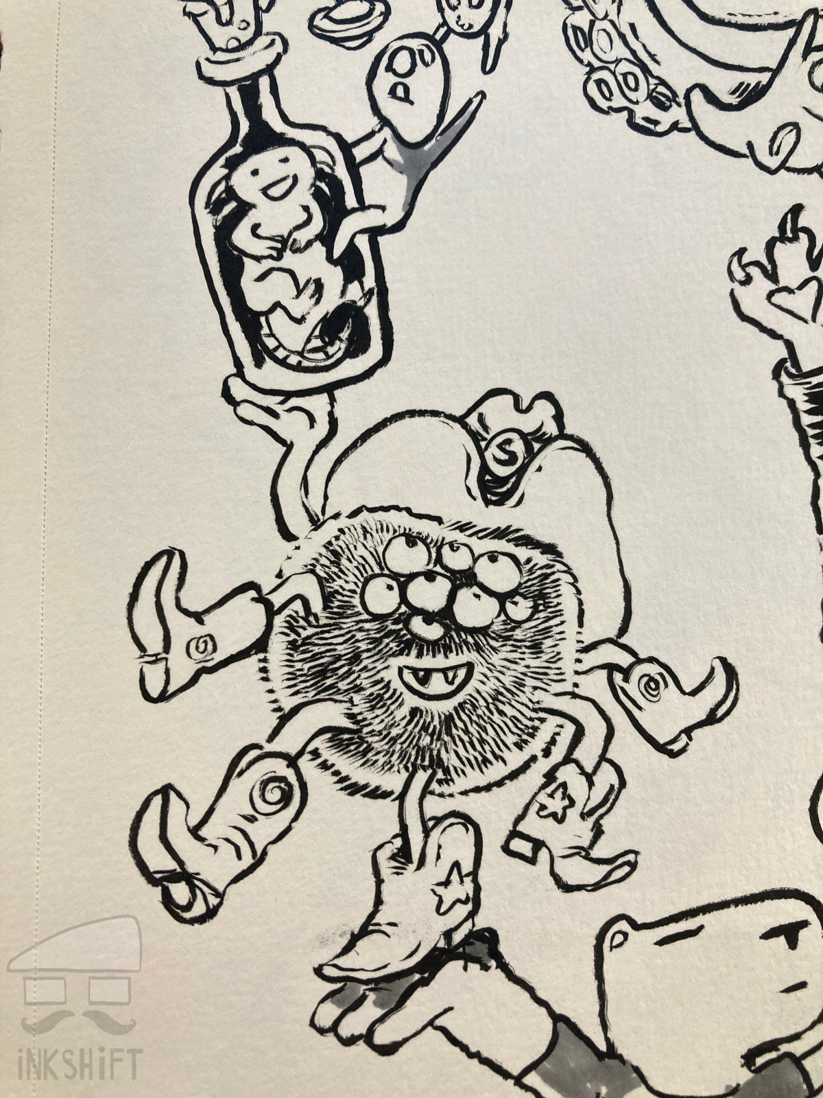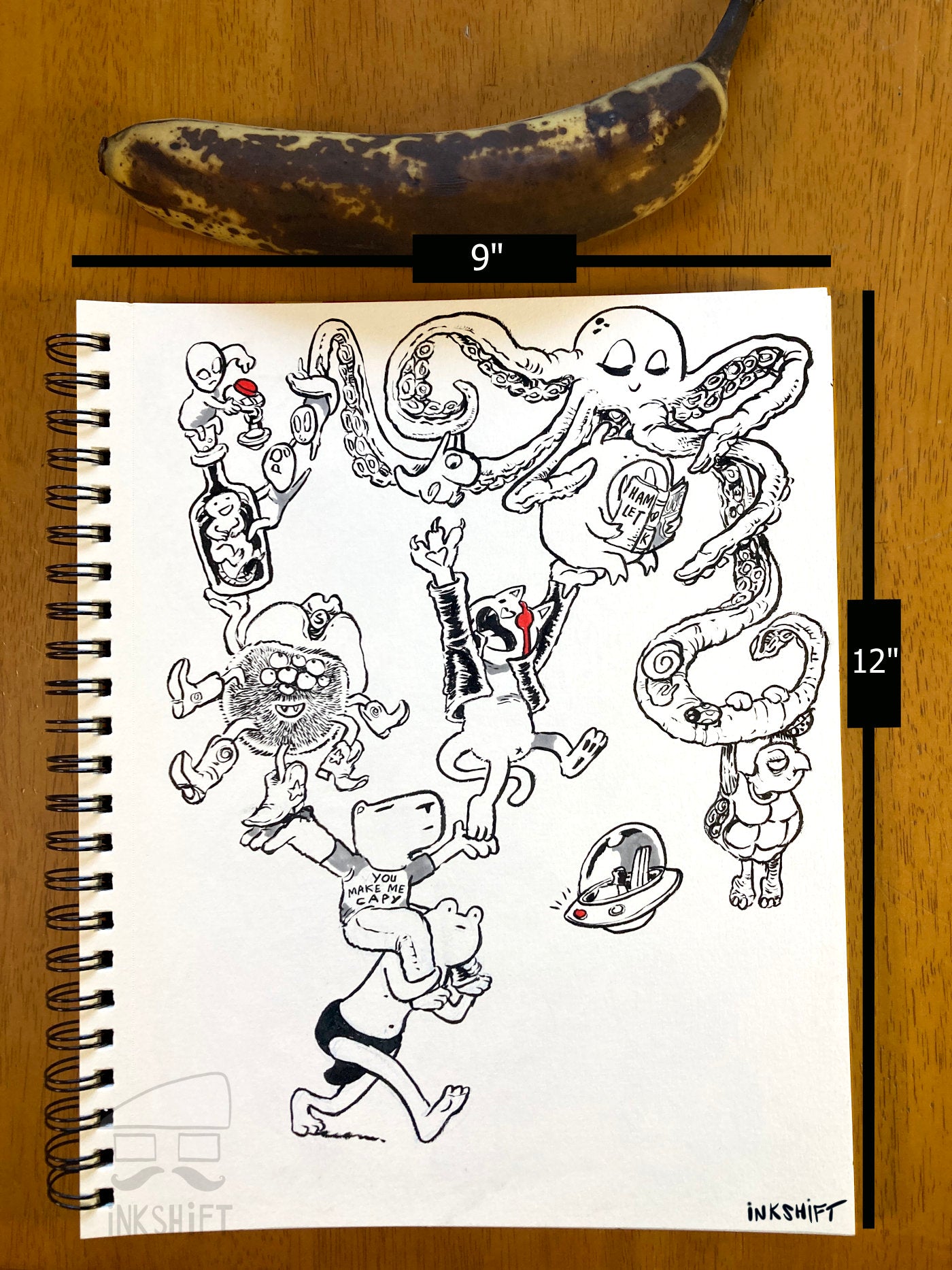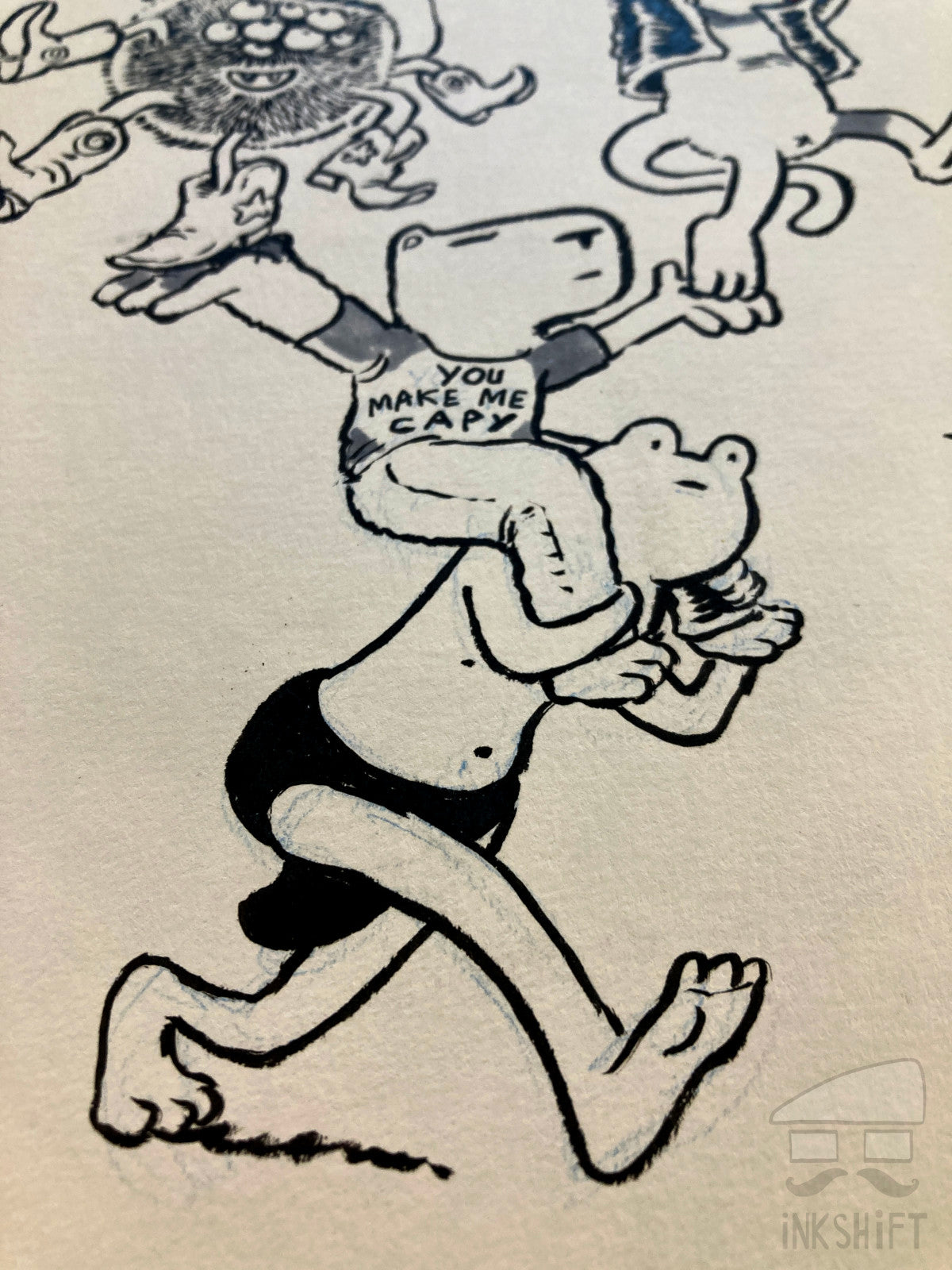 A free floating illustration straight to ink featuring Speedo Frog carrying his friends as easily as he carries you all in his large heart, full of kindness and love. Because he loves you! Featuring Spider in a Cowboy Hat, Capy, Octavia, the aliens, a loose turtle and of course Bacon.
